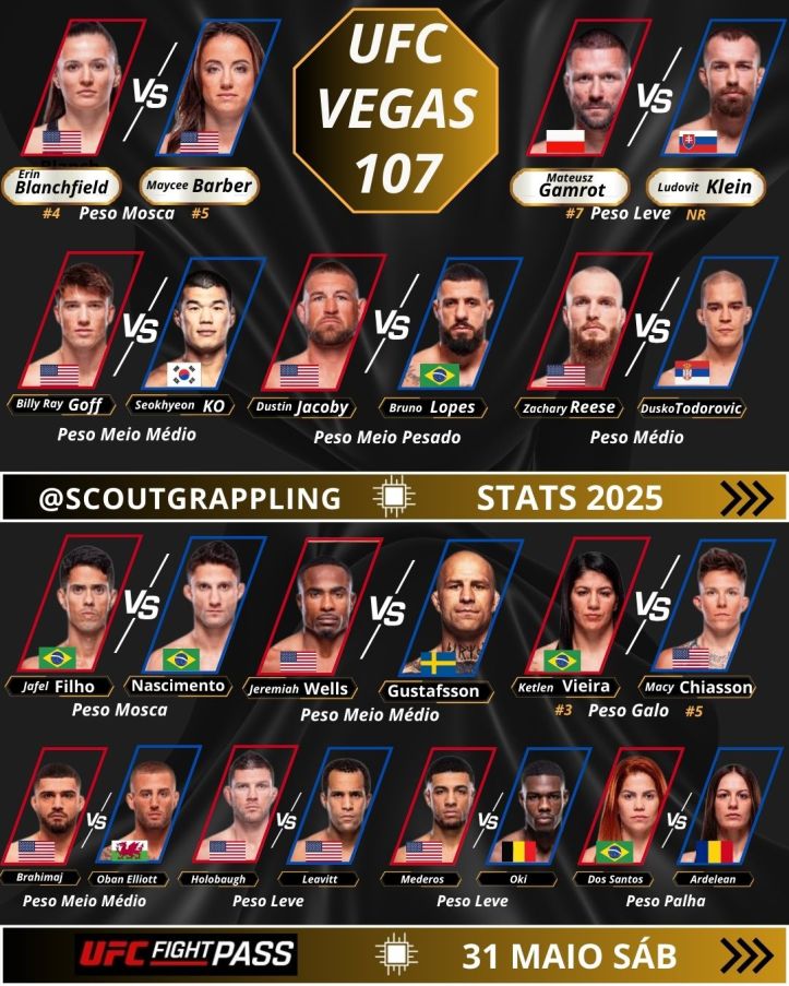 A contagem regressiva já começou. No dia 31 de maio, 24 atletas entram no octógono e prometem entregar TUDO pela vitória. Entre eles, 5 brasileiros(as) representando a Elite do MMA Nacional, carregando não só a nossa bandeira mas também, toda a força da nossa torcida.Na Scout Grappling, você acompanha o melhor do UFC com uma cobertura que vai além da notícia: aqui, mais do que informar, a gente forma opinião.